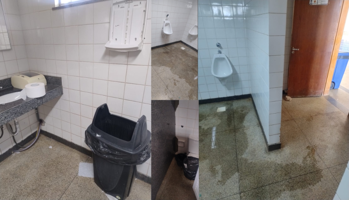 As fotos falam por si: vasos interditados com sacos de lixo, infiltrações no chão, equipamentos quebrados e fiação exposta. O espaço, em vez de oferecer dignidade mínima, virou retrato de descaso.