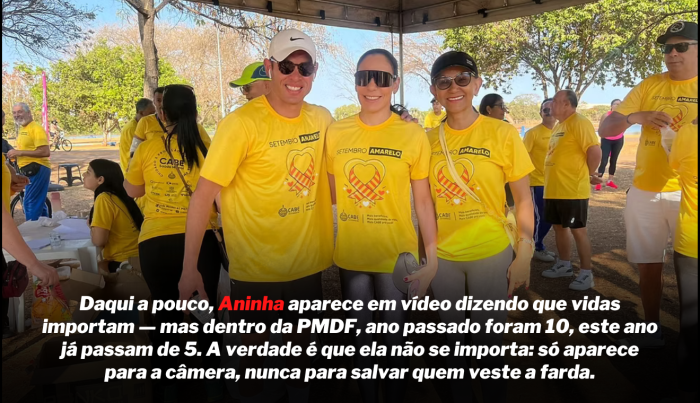 A cena de uma policial tentando tirar a própria vida não foi suficiente para interromper o curso, tampouco para gerar reação institucional imediata. O silêncio da cúpula soou como endosso. E a contradição é brutal: enquanto a sociedade se prepara para o Setembro Amarelo, mês de prevenção ao suicídio, a PMDF mostrou que a vida de uma de suas integrantes pode ser descartada sem constrangimento.