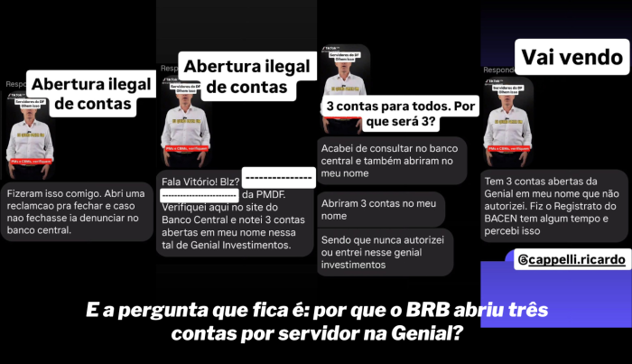 Mas o esquema não para por aí. O que veio à tona agora é ainda mais grave: servidores do Governo do Distrito Federal começam a descobrir que o BRB, sem qualquer autorização, tem se apropriado de seus dados pessoais para abrir contas de investimento na Genial Investimentos.