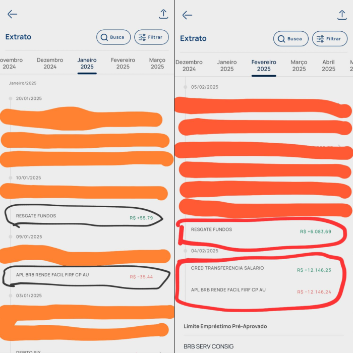 Mas em alguns casos, servidores passaram a perceber descontos diretos em aplicações e resgates de “fundos” que nunca souberam de onde vinham. O salário entrava e, logo em seguida, aparecia aplicado e resgatado como se fosse uma operação automática. Só depois de reclamar formalmente ao banco esses lançamentos cessaram — mas o rastro no extrato mostra como o CPF do servidor foi usado sem qualquer controle do titular.